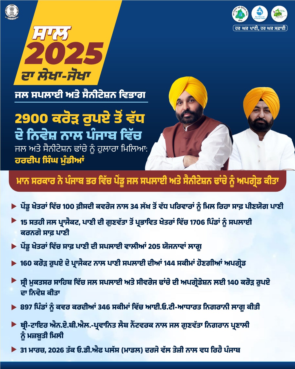 Punjab Water Supply and Sanitation Minister S. Hardeep Singh Mundian informed that Chief Minister S. Bhagwant Singh Mann-led Government has channelled investment of over Rs.2,900 crore towards strengthening water supply and sanitation infrastructure across Punjab. He said this sustained financial push has accelerated completion of major projects, expanded technology adoption and reinforced water quality and sanitation systems, with the direct outcome of improving daily lives in rural and semi-urban areas. He said that with 100 percent coverage, over 34 lakh families are currently receiving safe and potable drinking water in the state. The Minister informed that for FY 2025-26, the annual implementation plan of Rs.2,190.80 crore, in rural sanitation sector, has been approved for rural development in the state.
