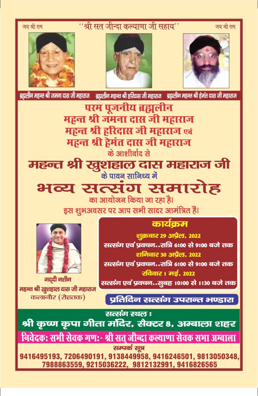 अम्बाला : श्रीकृष्ण कृपा गीता मंदिर, सैक्टर-8, अम्बाला शहर में भव्य सत्संग समारोह का आयोजन किया जा रहा है। तीन दिवसीय यह समारोह शुक्रवार 29 अप्रैल को आरम्भ होगा। जिसमें पहले एवं दूसरे दिन सत्संग एवं प्रवचन सांय 6 बजे से रात्रि 9 बजे तक आयोजित होंगे। रविवार 1 मई को समापन दिवस पर सत्संग एवं प्रवचन सुबह 10 बजे से दोपहर 1:30 बजे तक होंगे। यह समारोह महन्त श्री खुशहाल दास जी महाराज गद्दी नशीन कलानौर (रोहतक) के सानिध्य में आयोजित किया जाएगा। यह जानकारी श्री सत् जीन्दा कल्याणा सेवक सभा अम्बाला के सदस्यों ने देते हुए बताया कि प्रतिदिन सत्संग एवं प्रवचन के उपरान्त भण्डारे का भी आयोजन किया जाएगा।