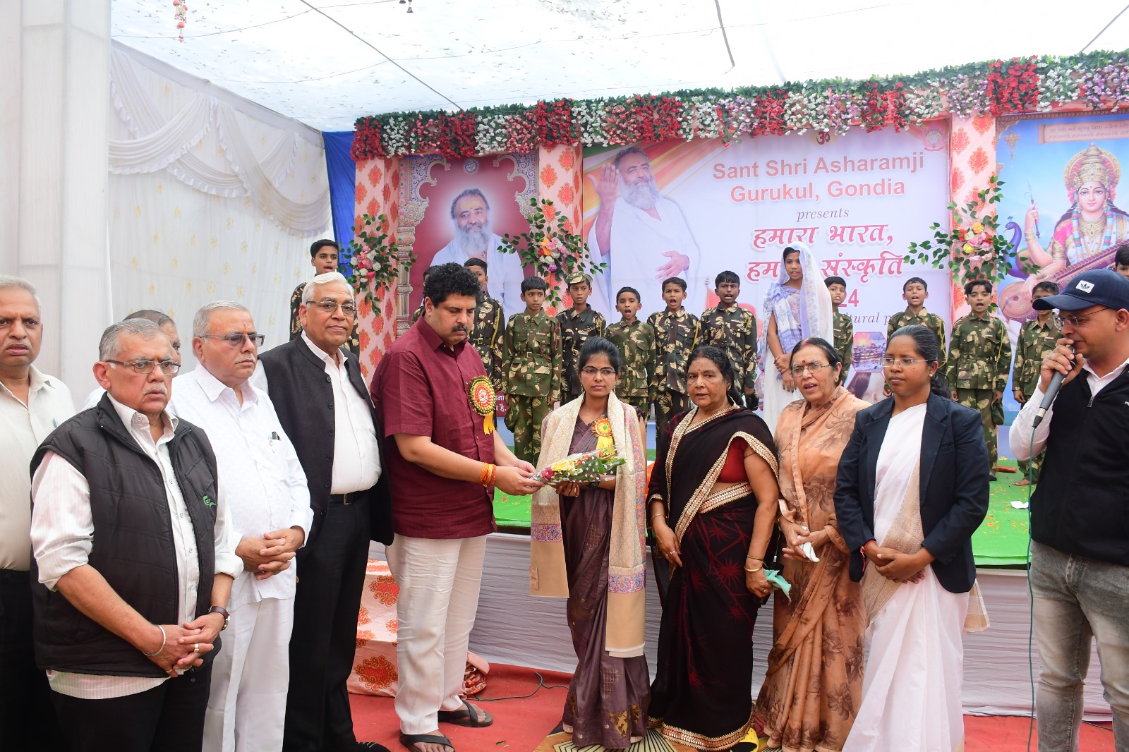 छिंदवाड़ा(सुशील सिंह परिहार)- मेरा भारत, मेरी संस्कृति 2023 -24 संत श्री आशारामजी गुरुकुल, गोंदिया में वार्षिक उत्सव का कार्यक्रम आयोजित किया गया, जिसमें मुख्य अतिथि के रूप में गोंदिया विधायक श्री विनोद जी अग्रवाल एवं तुमखेड़ा के शहीद स्वर्गीय श्री सुरेश हुकलाल नागपूरे की धर्मपत्नी श्रीमती अभिलाषा सुरेश नागपूरे उपस्थित रहे।परम पूज्य गुरुदेव के व्यासपीठ पूजन के साथ ही कार्यक्रम का शुभारंभ किया गया।गुरुकुल के छात्र-छात्राओं ने रंगारंग कार्यक्रम प्रस्तुत कर सभी दर्शकों का मन मोह लिया । गुरुकुल संचालिका नीता बहन के द्वारा गुरुकुल की प्रस्तावना प्रस्तुत की गई।शहीद श्री सुरेश हुकलाल नागपूरे जी को श्रद्धांजलि स्वरुप विशेष नृत्य – नाटिका का आयोजन किया गया, जिसे देखकर कार्यक्रम में उपस्थित सभी दर्शक देशभक्ति से ओतप्रोत हो गए। इस कार्यक्रम के पश्चात श्रीमती अभिलाषा सुरेश नागपूरे जी का विशेष स्वागत और अभिनंदन गोंदिया विधायक श्री विनोद जी अग्रवाल एवं गुरुकुल समिति के सभी सदस्यों द्वारा शॉल तथा श्रीफल देकर किया गया ।माननीय विधायक विनोद जी अग्रवाल ने गुरुकुल के संस्कार शिक्षा के साथ संस्कार पूर्ण विद्यार्थियों की प्रस्तुति देखकर अत्यंत प्रभावित हुए एवं सभी अभिभावकों को ऐसे ही गुरुकुल से जुड़े रहने की अपील की।कार्यक्रम में बाल संस्कार तथा महिला मंडल प्रभारी कुमारी एकता अनवानी बहन ने तुलसी पूजन के महत्व एवं औषधीय गुर्णो की जानकारी सभी के समक्ष रखी तथा साथ ही अबेकस की शिक्षिका श्रीमती पूजा बैस के द्वारा अबेकस का परिचय सभी के समक्ष रखा गया। साथ ही गुरुकुल के मैथ्स ओलिंपियाड के सभी विद्यार्थियों को मेडल तथा सर्टिफिकेट देकर सम्मानित भी किया गया।कार्यक्रम में श्री हेमंत रुद्राकर जी एवं श्रीमती मीनेश्वरी माहुले ने गुरुकुल में प्रवेश दिलाने के पश्चात उनके बालक – बालिकाओं में हुए परिवर्तन से सभी को अवगत कराया एवं गुरुकुल की प्रभावी प्रस्तुति का वर्णन भी किया।कार्यक्रम की अंतिम कड़ी में गुरुकुल समिति अध्यक्ष श्री शंकर लाल जी अग्रवाल द्वारा धन्यवाद ज्ञापन के साथ कार्यक्रम की समाप्ति की गई।समिति के अन्य सदस्य कोषाध्यक्ष श्री चोइथराम गोपलानी जी, सचिव श्री विनोद (गुड्डू) चंदवानी जी, सहसचिव श्री प्रदीप चामट, सदस्य श्री भगत ठकरानी जी, श्रीमती कशिश संजय गोपलानी जी, आश्रम संचालक श्री पंकज भाई, श्रीमती किरण शंकर लाल अग्रवाल जी, श्रीमती आशा भगत ठकरानी जी, श्री आत्माराम गोपलानी जी, श्री बंजारे जी विशेष रूप से उपस्थित रहे।