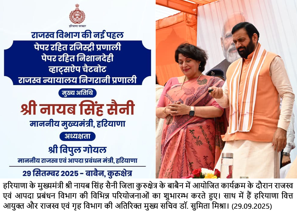 चंडीगढ़, 29 सितंबर — हरियाणा के मुख्यमंत्री श्री नायब सिंह सैनी ने कहा कि सरकार पेपरलेस रजिस्ट्रेशन करके राजस्व विभाग में भ्रष्टाचार की जड़ों पर सीधा प्रहार कर रही है। मानवीय हस्तक्षेप न्यूनतम होगा तो भ्रष्टाचार की गुंजाइश कतई नहीं रहेगी। अब रजिस्ट्री का काम पूर्णत: डिजिटल होगा, जिसमें यह पहल मिनिमम गवर्नमेंट-मैक्सिमम गवर्नेंस की हमारी नीति का जीवंत उदाहरण है। पेपरलेस रजिस्ट्रेशन से पर्यावरण का भी बचाव होगा।