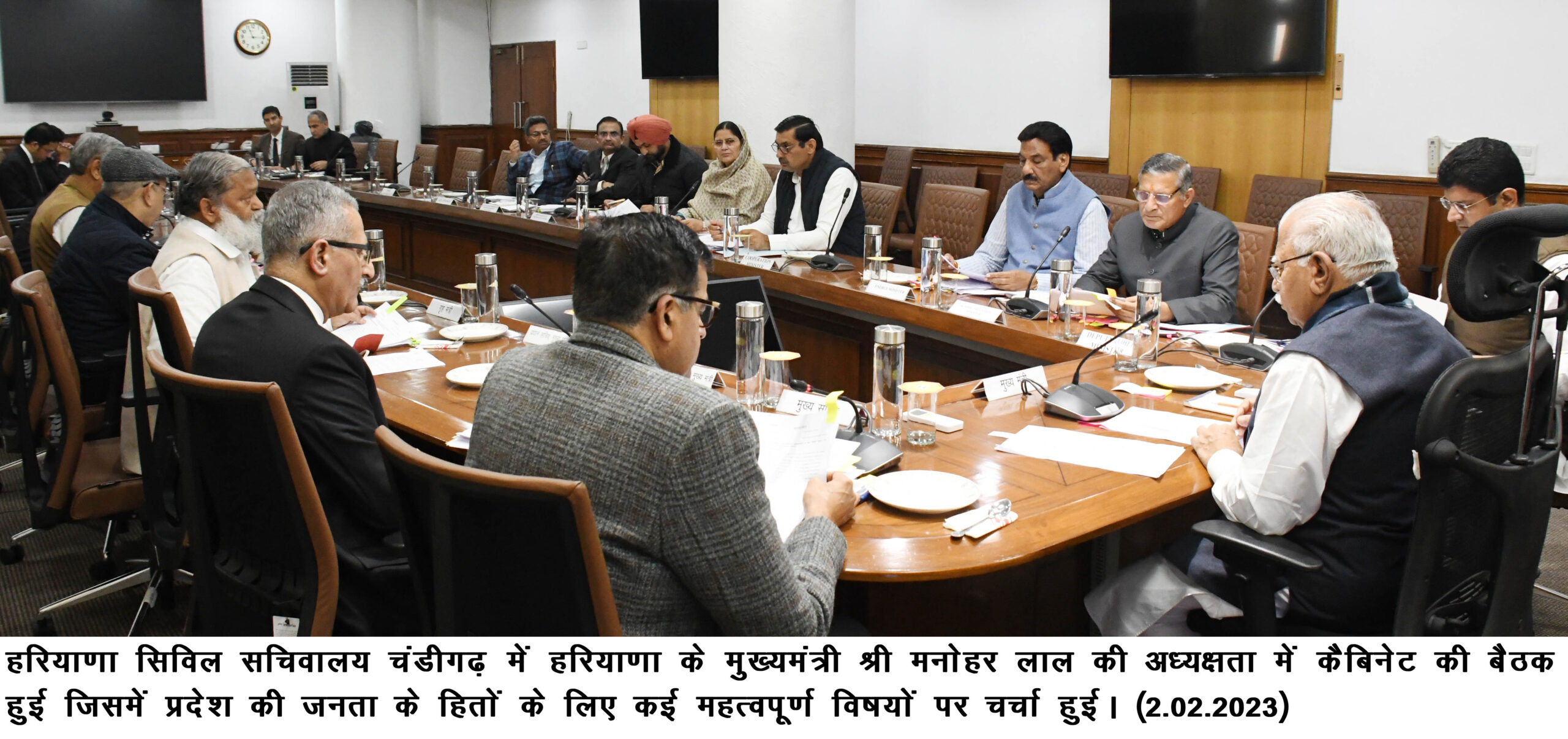 चंडीगढ़,02-02-23(प्रेस की ताकत ):- हरियाणा सिविल सचिवालय चंडीगढ़ में हरियाणा के मुख्यमंत्री श्री मनोहर लाल की अध्यक्षता में कैबिनेट की बैठक हुई जिसमें प्रदेश की जनता के हितों के लिए कई महत्वपूर्ण विषयों पर चर्चा हुई।