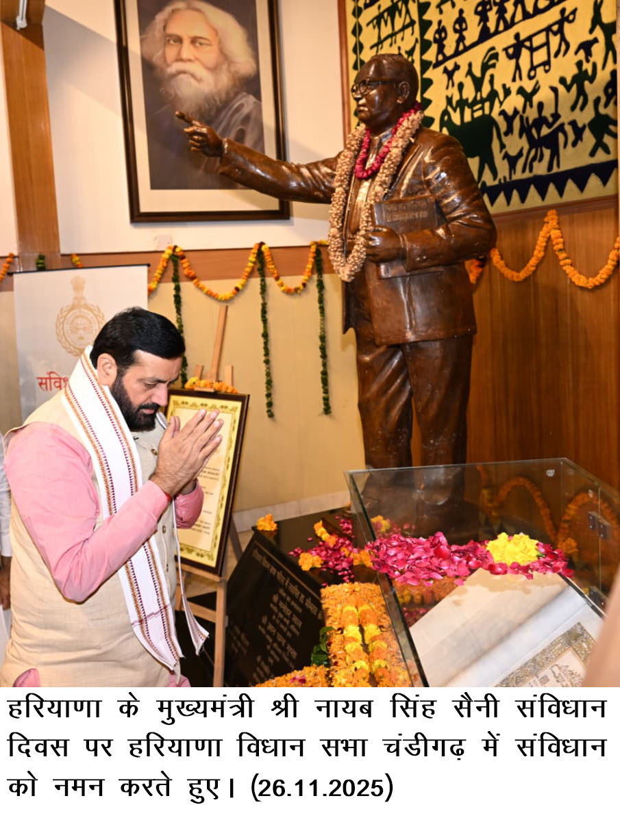 चंडीगढ़, 26 नवंबर — संविधान दिवस के अवसर पर हरियाणा के मुख्यमंत्री श्री नायब सिंह सैनी बुधवार को हरियाणा विधानसभा पहुंचे और वहां आयोजित कार्यक्रम में शामिल होकर प्रदेशवासियों को संविधान दिवस की हार्दिक बधाई एवं शुभकामनाएं दीं। मुख्यमंत्री ने कहा कि आज हम सभी के लिए गर्व का दिन है, क्योंकि भारतीय संविधान ने देश के प्रत्येक नागरिक को समान अवसर, न्याय और गरिमा के साथ आगे बढ़ने का अधिकार प्रदान किया है।