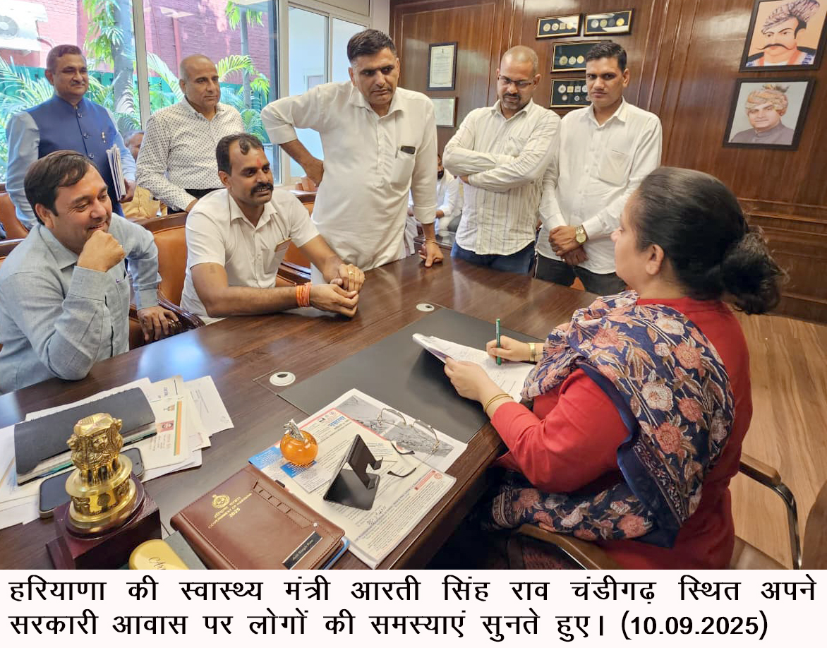 चंडीगढ़, 10 सितम्बर — हरियाणा की स्वास्थ्य मंत्री आरती सिंह राव ने आज चंडीगढ़ स्थित अपने सरकारी आवास पर जन-सुनवाई कार्यक्रम का आयोजन किया। इस दौरान उन्होंने विभिन्न जिलों से आए नागरिकों की समस्याओं को ध्यानपूर्वक सुना तथा संबंधित अधिकारियों को इन समस्याओं के शीघ्र समाधान के निर्देश दिए।