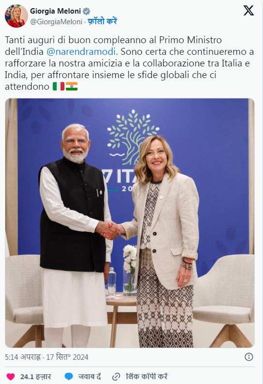 सोशल मीडिया प्लेटफॉर्म एक्स (पूर्व में ट्विटर) पर एक पोस्ट में, उन्होंने कहा, “भारत के प्रधानमंत्री नरेंद्र मोदी को जन्मदिन की शुभकामनाएं। मुझे विश्वास है कि हम वैश्विक चुनौतियों से मिलकर निपटने के लिए इटली और भारत के बीच अपनी दोस्ती और सहयोग को मजबूत करना जारी रखेंगे।” प्रधानमंत्री नरेंद्र मोदी आज, मंगलवार, 17 सितंबर, 2024 को अपना 74वां जन्मदिन मना रहे हैं। उनका जन्म 17 सितंबर, 1950 को गुजरात के छोटे से शहर मेहसाणा में हुआ था।