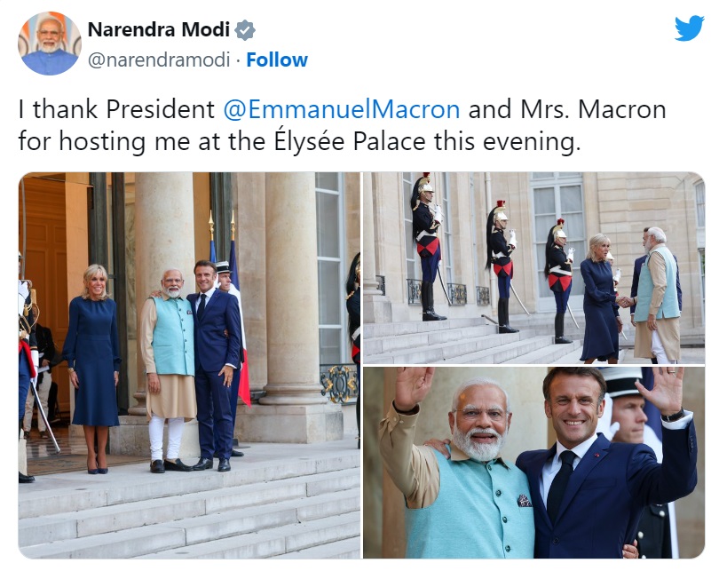 प्रधानमंत्री नरेंद्र मोदी को बृहस्पतिवार को पेरिस में भव्य स्वागत किया गया। दो दिवसीय इस यात्रा के दौरान वह राष्ट्रपति इमैनुएल मैक्रों के साथ विभिन्न मुद्दों पर चर्चा करेंगे। इस यात्रा से सामरिक साझेदारी मजबूत होने की उम्मीद जताई जा रही है। फ्रांस की प्रधानमंत्री एलिजाबेथ बोर्न ने हवाई अड्डे पर मोदी की अगवानी की। हवाई अड्डे पर उन्हें गार्ड ऑफ ऑनर दिया गया और दोनों देशों का राष्ट्रगान बजाया गया।