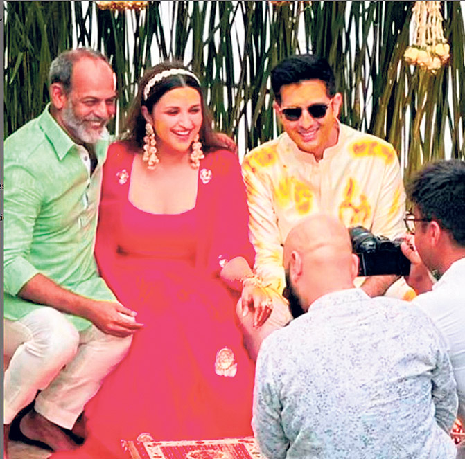 बॉलीवुड एक्ट्रेस परनीति चोपड़ा और आप नेता राघव चड्ढा पिछले हफ्ते शादी के बंधन में बंध गए। अब उनकी शादी की तस्वीरें सामने आ रही हैं। उनकी ऐसी ही एक तस्वीर सोशल मीडिया पर घूम रही है. ये तस्वीर ‘हल्दी’ सेरेमनी की है. इसमें परनीति मुस्कुराती नजर आ रही हैं और उनके साथ राघव चड्ढा भी बैठे नजर आ रहे हैं. एक्ट्रेस ने हल्के गुलाबी रंग की ड्रेस पहनी हुई है. उन्होंने बालों पर सफेद हेयरबैंड और कानों में सुनहरे झुमके पहने हुए हैं। राघव चड्ढा सफेद कुर्ता पायजामा और शर्ट पर हल्दी लगाए बैठे हैं। वे फूलों की छतरी के नीचे बैठे हैं और अपने दोस्तों और परिवार से घिरे हुए हैं। तस्वीर परिणीति के फैन पेज से शेयर की गई है. इस जोड़े की सगाई मई में दिल्ली में हुई थी। फिर वे शादी करने के लिए उदयपुर चले गए। यहां मेहंदी और अन्य विवाह समारोह भी आयोजित किए गए। वे रविवार को शादी के बंधन में बंध गए। उनके विवाह समारोह में बॉलीवुड और राजनीतिक हस्तियां शामिल हुईं।