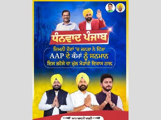 ਉਨ੍ਹਾਂ ਕਿਹਾ ਕਿ ਪੰਜਾਬ ਦੇ ਲੋਕਾਂ ਨੇ ਜ਼ਿਮਨੀ ਚੋਣਾਂ ਵਿਚ ਆਮ ਆਦਮੀ ਪਾਰਟੀ ਨੂੰ ਚਾਰ ਵਿਚੋਂ ਤਿੰਨ ਸੀਟਾਂ ਦੇ ਕੇ ਇਕ ਵਾਰ ਫਿਰ ਆਮ ਆਦਮੀ ਪਾਰਟੀ ਦੀ ਵਿਚਾਰਧਾਰਾ ਅਤੇ ਸਾਡੀ ਸਰਕਾਰ ਦੇ ਕੰਮਾਂ ਵਿਚ ਆਪਣਾ ਵਿਸ਼ਵਾਸ ਜ਼ਾਹਰ ਕੀਤਾ ਹੈ। ਪੰਜਾਬ ਦੇ ਲੋਕਾਂ ਦਾ ਬਹੁਤ-ਬਹੁਤ ਧੰਨਵਾਦ ਅਤੇ ਸਾਰਿਆਂ ਨੂੰ ਬਹੁਤ-ਬਹੁਤ ਵਧਾਈਆਂ।