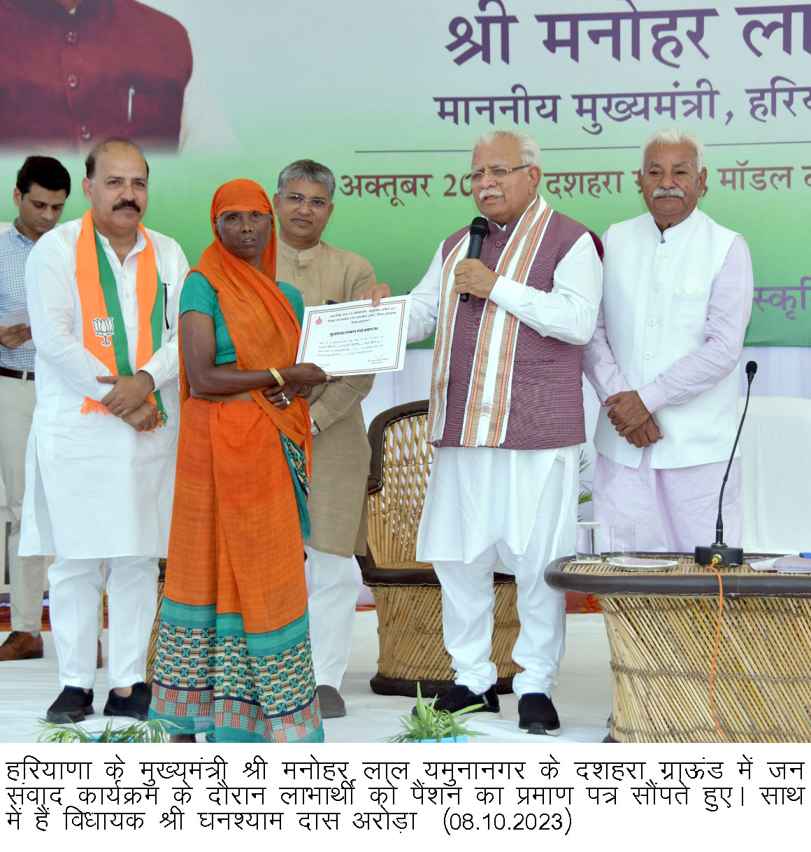 ਲੋਕ ਸੰਵਾਦ ਪ੍ਰੋਗਰਾਮ ਦੌਰਾਨ ਮੁੱਖ ਮੰਤਰੀ ਨੇ ਕਿਹਾ ਕਿ 60 ਸਾਲ ਦੀ ਉਮਰ ਪੂਰੀ ਕਰ ਚੁੱਕੇ ਅਤੇ 3 ਲੱਖ ਰੁਪਏ ਤੋਂ ਘੱਟ ਆਮਦਨ ਵਾਲੇ 11 ਵਿਅਕਤੀਆਂ ਦੀ ਪੈਨਸ਼ਨ ਤੁਰੰਤ ਜਾਰੀ ਕਰ ਦਿੱਤੀ ਗਈ ਅਤੇ ਮੁੱਖ ਮੰਤਰੀ ਨੇ ਉਨ੍ਹਾਂ ਨੂੰ ਪੈਨਸ਼ਨ ਸਰਟੀਫਿਕੇਟ ਸੌਂਪੇ ਅਤੇ ਵਧਾਈ ਦਿੱਤੀ| ਇਸ ਮੌਕੇ ਯਮੁਨਾਨਗਰ ਦੇ ਵਿਧਾਇਕ ਘਨਸ਼ਿਆਮ ਦਾਸ ਅਰੋੜਾ ਨੇ ਮੁੱਖ ਮੰਤਰੀ ਅਤੇ ਹੋਰ ਮਹਿਮਾਨਾਂ ਦਾ ਸਵਾਗਤ ਕੀਤਾ|