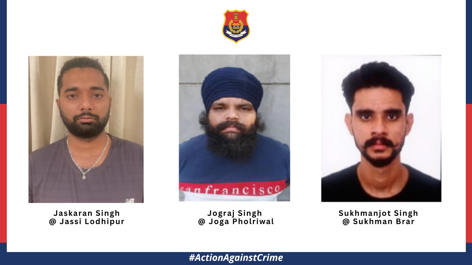 ਪੁਲਿਸ ਦੇ ਡਾਇਰੈਕਟਰ ਜਨਰਲ (ਡੀਜੀਪੀ) ਪੰਜਾਬ ਗੌਰਵ ਯਾਦਵ ਨੇ ਗ੍ਰਿਫ਼ਤਾਰ ਕੀਤੇ ਗਏ ਸ਼ੂਟਰਾਂ ਦੀ ਪਛਾਣ ਜਲੰਧਰ ਦੇ ਨਿਊ ਦਿਓਲ ਨਗਰ ਦੇ ਸੁਖਮਨਜੋਤ ਸਿੰਘ ਉਰਫ਼ ਸੁਖਮਨ ਬਰਾੜ, ਐਸਬੀਐਸ ਨਗਰ ਦੇ ਪਿੰਡ ਲੋਧੀਪੁਰ ਦੇ ਜਸਕਰਨ ਸਿੰਘ ਉਰਫ਼ ਜੱਸੀ ਲੋਧੀਪੁਰ ਅਤੇ ਜਲੰਧਰ ਦੇ ਪਿੰਡ ਫਲੋਰੀਵਾਲ ਦੇ ਜੋਗਰਾਜ ਸਿੰਘ ਉਰਫ਼ ਜੋਗਾ ਵਜੋਂ ਕੀਤੀ ਹੈ। ਉਨ੍ਹਾਂ ਦੱਸਿਆ ਕਿ ਪੁਲਿਸ ਟੀਮਾਂ ਨੇ ਇਨ੍ਹਾਂ ਕੋਲੋਂ .32 ਬੋਰ ਦੇ ਤਿੰਨ ਵਿਦੇਸ਼ੀ ਪਿਸਤੌਲ ਵੀ ਬਰਾਮਦ ਕੀਤੇ ਹਨ।
