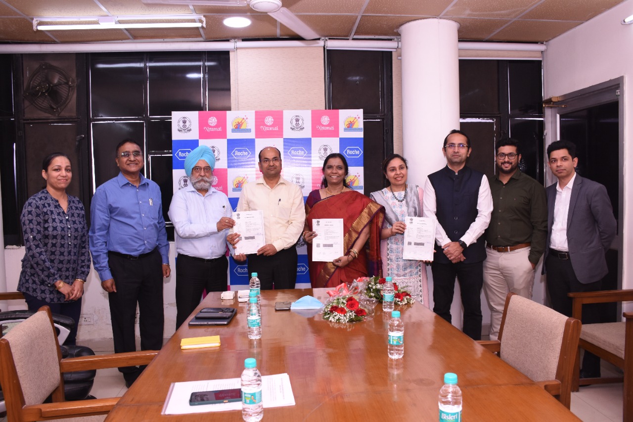 फोटो कैप्शन: एम.डी.एन.एच.एम. कुमार राहुल, डायरैक्टर स्वास्थ्य एवं परिवार कल्याण डॉक्टर जी.बी. सिंह, डॉक्टर सन्दीप सिंह प्रोग्राम अफ़सर निरमयी और रोशे के अधिकारी एम.ओ.यू. पर हस्ताक्षर करने के उपरांत।