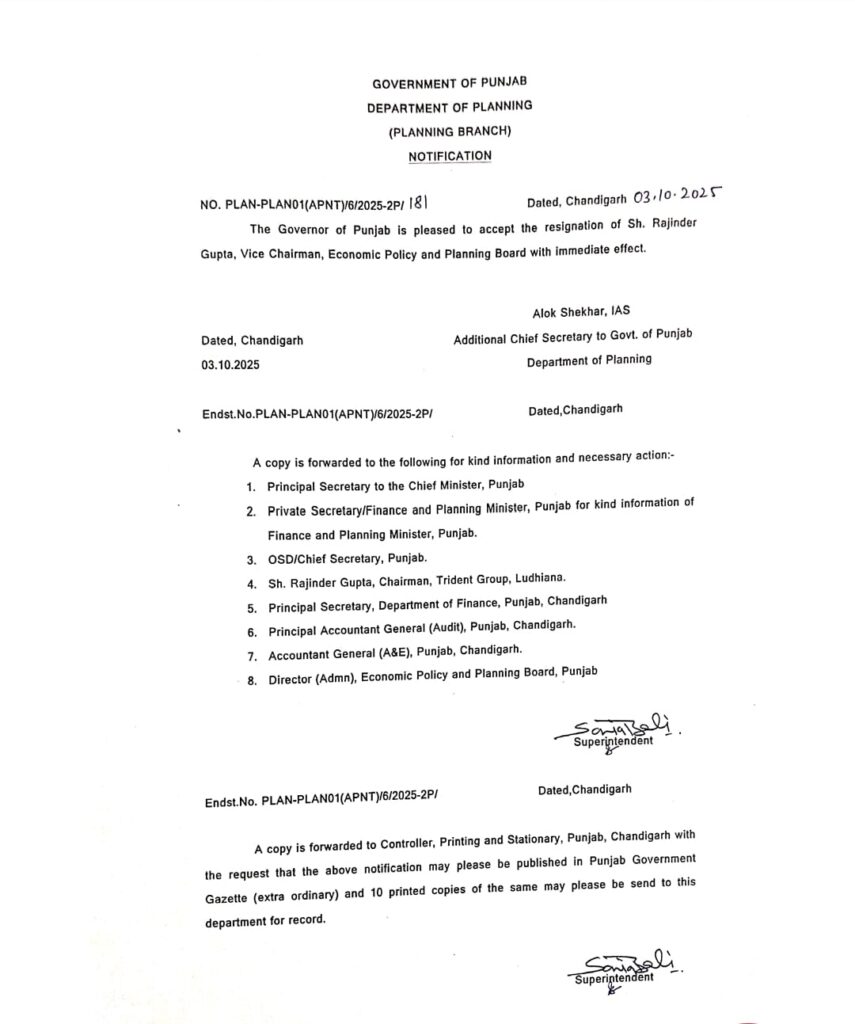 ਟਰਾਈਡੈਂਟ ਗਰੁੱਪ ਦੇ ਸੰਸਥਾਪਕ ਰਜਿੰਦਰ ਗੁਪਤਾ ਵੱਲੋਂ ਯੋਜਨਾ ਬੋਰਡ ਪੰਜਾਬ ਦੇ ਵਾਈਸ ਚੇਅਰਮੈਨੀ ਦੇ ਅਹੁਦੇ ਤੋਂ ਦਿੱਤਾ ਗਿਆ ਅਸਤੀਫਾ ਮਨਜ਼ੂਰ ਕਰ ਲਿਆ ਗਿਆ ਹੈ। ਪੰਜਾਬ ਦੇ ਰਾਜਪਾਲ ਵੱਲੋਂ ਰਜਿੰਦਰ ਗੁਪਤਾ ਦਾ ਦਿੱਤਾ ਗਿਆ ਅਸਤੀਫਾ ਮਨਜ਼ੂਰ ਕੀਤਾ ਗਿਆ ਹੈ।