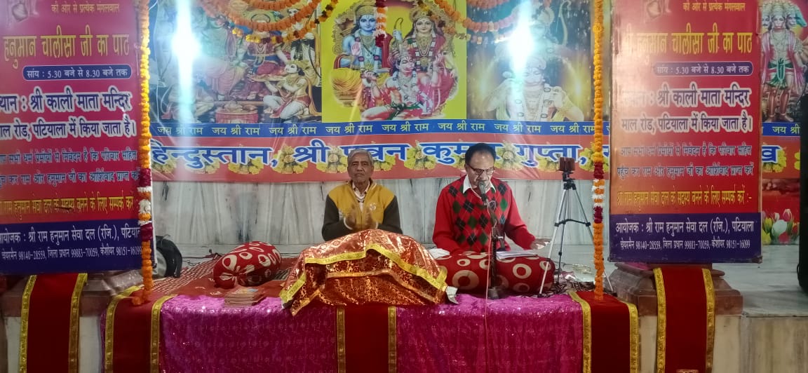 पटियाला, 1 दिसम्बर (प्रेस की ताकत बयूरो)- शिव सेना हिंदुस्तान की धार्मिक शाखा श्री राम हनुमान सेवा दल जो कि लगातार 14 वर्षों से प्रत्येक मंगलवार श्री हनुमान चालीसा जी का पाठ श्री काली माता मंदिर के प्रांगण में विधि विधान से किया जाता है। इस मंगलवार को भी प्रत्येक मंगलवार की तरह श्री हनुमान चालीसा का पाठ तथा प्रभु संकीर्तन किया गया। इस बार व्यासपीठ पर विराजमान प्रसिद्ध भजन गायक श्री रमेश मिश्रा जी एवं हरि प्रमोद जी ने अपने भजनों के माध्यम से बताया कि अंधेरा नाम की कोई चीज नहीं है यह सिर्फ प्रकाश की अनुपस्थिति है अगर प्रकाश हो तो अंधेरा कभी आता ही नहीं इसलिए हमेशा कोशिश करें कि प्रकाश मई बना करके रखें ताकि अंधेरा आने की कोई आशंका ना रहे इसी तरह समस्या नाम की कोई चीज नहीं है यह सिर्फ समाधान खोजने के लिए एक विचार का अभाव है समस्या तब आती है जब हमें कोई समाधान नहीं मिलता इसलिए समाधान यदि मिल जाए तो समस्या का आने का कोई मतलब ही नहीं बनता दिल की धड़कन से एहसास तुम्हारा होता है थामें कोई हाथ तो वह हाथ प्रभु तुम्हारा होता है चलती है हवाएं तो वह प्यार तुम्हारा होता है मेरे बजरंगी हनुमान जी अब तो हर बात में जिक्र तुम्हारा होता है